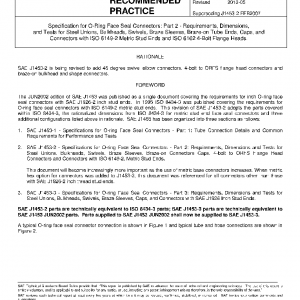 The three parts of SAE J1453 cover material, dimensional, and performance requirements of steel O-ring face seal (ORFS) connectors for tubing and the O-ring face seal interface and nut portion of hose stem assemblies for nominal tube diameters of 6 mm through 38 mm and for nominal hose diameters 6.3 mm through 38 mm. SAE J1453-2 covers the requirements for “metric based” O-ring face seal connectors to metric stud ends along with the associated adapters, bulkhead and union connectors. Metric hex wrenching flats are used throughout this standard.
