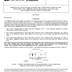 The three parts of SAE J1453 cover material, dimensional, and performance requirements of steel O-ring face seal (ORFS) connectors for tubing and the O-ring face seal interface and nut portion of hose stem assemblies for nominal tube diameters of 6 mm through 38 mm and for nominal hose diameters 6.3 mm through 38 mm. SAE J1453-3 covers the requirements for “inch based” O-ring face seal connectors to inch stud ends along with the associated adapters, bulkhead and union connectors. Inch hex wrenching flats are predominantly used throughout this standard.