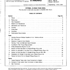 This SAE Standard covers material, dimensional, and performance requirements of steel O-ring face seal fittings for tubing and the O-ring face seal interface and nut portion of hose stem assemblies for nominal tube or hose diameters 6.35 mm (0.250 in) through 38.1 mm (1.500 in). These fittings are intended for general application and hydraulic systems on industrial equipment and commercial products, where elastomeric seals are acceptable to overcome leakage and variations in assembly procedures. These fittings are capable of providing leak proof full flow connections in hydraulic systems operating from 95 kPa (28 in Hg) vacuum to working pressures shown in Table 1. Since many factors influence the pressure at which a hydraulic system will or will not perform satisfactorily, these values should not be construed as guaranteed minimums. For any application, it is recommended that sufficient testing be conducted and reviewed by both the user and manufacturer to assure that required performance levels will be safe. See Figure 1.