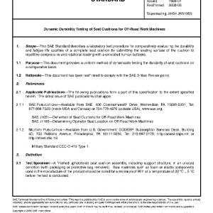 This SAE Standard describes a laboratory test procedure for comparatively evaluating the durability and fatigue life qualities of a complete seat cushion by submitting the seating surface of the cushion to repetitive compressive and rotational loading with a simulated human buttocks.