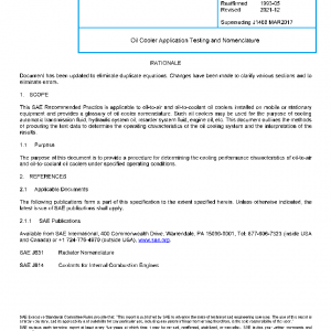 This SAE Recommended Practice is applicable to oil-to-air and oil-to-coolant oil coolers installed on mobile or stationary equipment and provides a glossary of oil cooler nomenclature. Such oil coolers may be used for the purpose of cooling automatic transmission fluid, hydraulic system oil, retarder system fluid, engine oil, etc. This document outlines the methods of procuring the test data to determine the operating characteristics of the oil cooling system and the interpretation of the results.