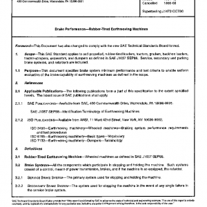 This SAE Standard applies to self-propelled, rubber-tired loaders, tractors, graders, back-hoe loaders, tractor-scrapers, excavators, and dumpers as defined in SAE J1057 SEP88. Service, secondary and parking brake systems, and retarders are included. This document specifies brake system minimum performance and test criteria to enable uniform evaluation of the brake capability of earthmoving machines as defined in the scope.
