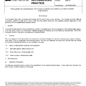 This SAE Recommended Practice establishes a method of evaluating the structural integrity of the parking brake system of all new trucks, buses, and combination vehicles designed for roadway use in the following classifications: TRACTOR, TRAILER, TRUCK, AND BUS: over 4500 kg (10 000 lb) GVWR.