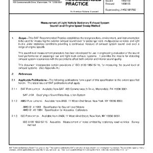 This SAE Recommended Practice establishes the test procedure, environment, and instrumentation to be used for measuring the exterior exhaust sound level for passenger cars, multipurpose vehicles, and light trucks under stationary conditions providing a continuous measure of exhaust system sound level over a range of engine speeds.