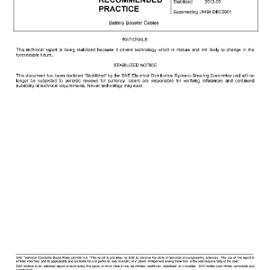 The purpose of this SAE Recommended Practice is to establish minimum performance and user information requirements for battery booster cable sets used with 6 OR 12-VOLT BATTERIES. Such sets may be used to provide a temporary connection of a surface vehicle battery to another similar battery to provide emergency power when required. This document DOES NOT ENDORSE NOR RECOMMEND the potentially hazardous procedure of jump-starting a vehicle.
