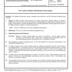 This SAE Standard details procedures for testing lead-acid SLI (starting, lighting, and ignition), Heavy-Duty, EV (electric vehicle) and RV (recreational vehicle) batteries to determine the effectiveness of the battery venting system to retard the propagation of an externally ignited flame of battery gas into the interior of the battery where an explosive mixture is usually present.