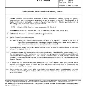 This SAE Standard details procedures for testing lead-acid SLI (starting, lighting, and ignition), Heavy-Duty, EV (electric vehicle) and RV (recreational vehicle) batteries to determine the effectiveness of the battery venting system to retard the propagation of an externally ignited flame of battery gas into the interior of the battery where an explosive mixture is usually present.