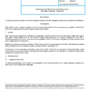 SAE J1502 specifies dimensions, performance requirements, and test procedures for the male half of a diagnostic coupler with either a metric M14x1.5 or an inch 9/16-18 straight thread stud end. The coupler is designed for use with a mineral-based hydraulic fluid. It is used on machines specified in SAE J1116. It does not apply to the mating hydraulic quick action couplings not on the machine.