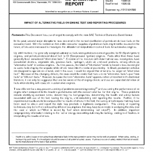 The report is organized into four technical sections, each dealing with an important aspect of testing or reporting of results when using alternative fuels. The first (Section 3) deals with such issues as what is a “fuel” in the context of engine operation. The next (Section 4) is concerned with identifying fuel properties. The third technical section (Section 5) covers the testing considerations and calculations for alternative fuels. The final technical section (Section 6) provides some guidelines for reporting the results so that sufficient information is given in a form that allows convenient comparison of the results from different investigations.