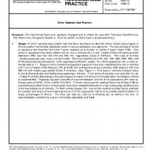 A driver selected seat position tool has been developed to describe where certain percentages of drivers position horizontally adjustable seats in various workspace arrangements. The tool consists of series of equations that describe horizontal H-point locations as a function of vehicle H-point height (H30). One series of equations have been established for use in vehicles with H-point heights (H30) and steering wheel diameters (W9) less than 405 mm and 450 mm, respectively (Class A Vehicles). This class of vehicles includes passenger cars, vans, and light trucks. The lines describe the 2.5th, 5th, 10th, 50th, 90th, 95th, and 97.5th percentile accommodation levels expressed as H-point location for a driver population with a male-to-female ratio of 1:1. Separate driver selected seat position equations have been established for use in vehicles with H-point heights (H30) between 405 and 530 mm and steering wheel diameters (W9) between 450 and 560 mm with treadle type pedals (Class B Vehicles). (See Figure 1.) This class of vehicles includes heavy trucks and some buses and multipurpose passenger vehicles. Three series of equations are available for use in Class B vehicles depending on the percentages of males and females in the population the designer wishes to accommodate. Separate equations describe the accommodation level for driver populations with male-to-female ratios of 50:50, 75:25, and 90:10 to 95:5. Different references for locating Class A and Class B driver selected seat position lines in vehicle space have been established based on unique packaging considerations of the two categories of vehicles. For both vehicle classes, the lines can be used as a design tool to estimate the location and length of horizontal seat travel aft of the appropriate reference to provide accommodation of target percentages of drivers. The lines can also be used as a checking tool to estimate the level of accommodation provided by a given horizontally adjustable seat track.