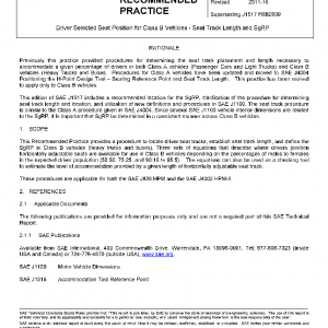 This Recommended Practice provides a procedure to locate driver seat tracks, establish seat track length, and define the SgRP in Class B vehicles (heavy trucks and buses). Three sets of equations that describe where drivers position horizontally adjustable seats are available for use in Class B vehicles depending on the percentages of males to females in the expected driver population (50:50, 75:25, and 90:10 to 95:5). The equations can also be used as a checking tool to estimate the level of accommodation provided by a given length of horizontally adjustable seat track.