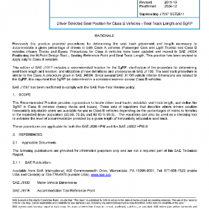 This Recommended Practice provides a procedure to locate driver seat tracks, establish seat track length, and define the SgRP in Class B vehicles (heavy trucks and buses). Three sets of equations that describe where drivers position horizontally adjustable seats are available for use in Class B vehicles depending on the percentages of males to females in the expected driver population (50:50, 75:25, and 90:10 to 95:5). The equations can also be used as a checking tool to estimate the level of accommodation provided by a given length of horizontally adjustable seat track.