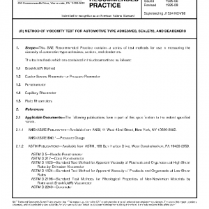 This SAE Recommended Practice contains a series of test methods for use in measuring the viscosity of automotive-type adhesives, sealers, and deadeners.