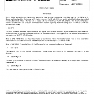 This SAE Standard specifies requirements for two types, three classes and four styles of reinforced hose and non-reinforced tubing for conveying gasoline or diesel fuel aboard small craft including pleasure craft whose fuel systems are regulated under 33 CFR 183 Subpart J.