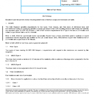 This SAE Standard specifies requirements for two types, three classes, and four styles of reinforced hose and non-reinforced tubing for conveying gasoline or diesel fuel aboard small craft including pleasure craft whose fuel systems are regulated under 33 CFR 183 Subpart J. SAE J1527 contains requirements for a Type A fire test of 2.5 minutes and defines a type B hose that is not fire resistant.