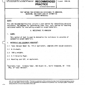 This SAE Recommended Practice contains a test method for determining abrasion resistance, two methods for determining fiber loss, and a method for bearding resistance useful for evaluating automotive carpet materials.