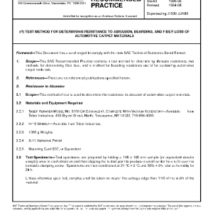 This SAE Recommended Practice contains a test method for determining abrasion resistance, two methods for determining fiber loss, and a method for bearding resistance useful for evaluating automotive carpet materials.