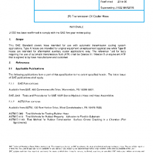 This SAE Standard covers hose intended for use with automatic transmission cooling system applications. Type A hoses are intended for original equipment or replacement applications while Type B hoses are intended for aftermarket auxiliary cooler applications only. The reference fluid for tests requiring the use of automatic transmission fluid (ATF) shall be Dexron III / Mercon 5 or equivalent ATF that is agreed to by hose manufacturer and customer.