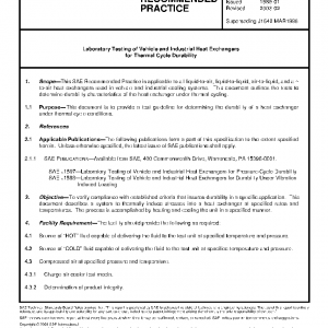 This SAE Recommended Practice is applicable to all liquid-to-air, liquid-to-liquid, air-to-liquid, and air-to-air heat exchangers used in vehicle and industrial cooling systems. This document outlines the tests to determine durability characteristics of the heat exchanger under thermal cycling.