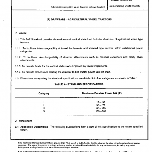 This SAE Standard provides dimensions and the vertical static load limits for drawbars of agricultural wheel type tractors.