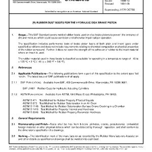 This SAE Standard covers molded rubber boots used on disc brake pistons to prevent the entrance of dirt and moisture which could cause corrosion and otherwise impair caliper operation.