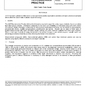 This SAE Recommended Practice defines the information required to repair the various types of plastics found on modern light-duty highway vehicles. Information is included for the repair and refinishing of most plastic body parts, both interior and exterior. Repair information is described for all commonly used plastics including, but not limited to, polyurethanes, polycarbonate blends, modified polypropylenes, polyethylenes and nylons. Repairs can be made to these types of plastics using two-part (2K) repair adhesives, plastic welding, and other materials available from body shop suppliers. When a new type of plastic is being introduced to the market through a new vehicle program, specific repair and refinishing procedures should be provided, following the format in this document.