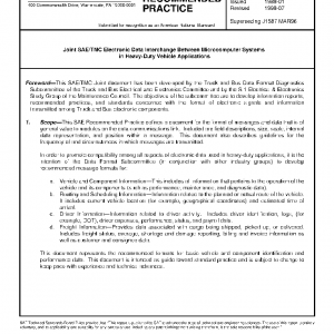 This SAE Recommended Practice defines a document for the format of messages and data that is of general value to modules on the data communications link. Included are field descriptions, size, scale, internal data representation, and position within a message. This document also describes guidelines for the frequency of and circumstances in which messages are transmitted.