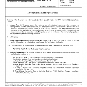 This SAE Standard covers the hardness and microstructural requirements for malleable iron castings-ferritic, pearlitic, tempered pearlitic, and tempered martensitic grades used in automotive and allied industries. Castings shall be heat treated to meet this SAE Standard. The Appendix provides general information on the application of malleable iron castings and their chemical composition to meet hardness, microstructure, and other properties needed for particular service conditions. The mechanical properties in the Appendix are provided for design purposes.