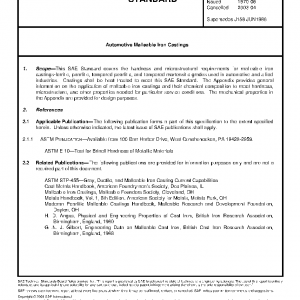 This standard covers the hardness and microstructural requirements for malleable iron castings – ferritic, pearlitic, tempered pearlitic, and tempered martensitic grades used in automotive and allied industries. Castings shall be heat treated to meet this SAE Standard. The Appendix provides general information on the application of malleable iron castings and their chemical composition to meet hardness, microstructure, and other properties needed for particular service conditions. The mechanical properties in the Appendix are provided for design purposes.