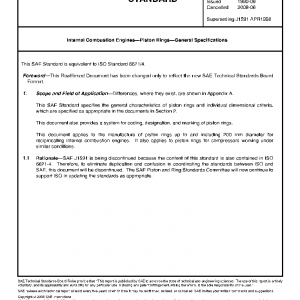 This SAE Standard specifies the general characteristics of piston rings and individual dimensional criteria, which are specified as appropriate in the documents in Section 2. This document also provides a system for coding, designation, and marking of piston rings. This document applies to the manufacture of piston rings up to and including 200 mm diameter for reciprocating internal combustion engines. It also applies to piston rings for compressors working under similar conditions.