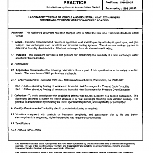 This SAE Recommended Practice is applicable to all liquid-to-gas, liquid-to-liquid, gas-to-gas, and gas-to-liquid heat exchangers used in vehicle and industrial cooling systems. This document outlines the test to determine durability characteristics of the heat exchanger from vibration-induced loading.