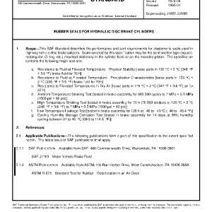 This SAE Standard describes the performance and part requirements for elastomeric seals used in highway vehicle disc brake calipers. Seals covered by this specification may be the solid section type (square, rectangular, O-ring, etc.) mounted stationary in the cylinder bore or on the movable piston. The specification contains the following major sections: