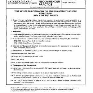 This test method provides a standardized procedure for evaluating the sealing capability of a hose connection or any of the individual components of the connection with a pressure, vibration, and temperature (PVT) test facility. This test method consists of a test procedure which includes vibration and coolant flow (#1) and a similar test procedure specified without vibration or coolant flow (#2). Any test parameters, other than those specified in this SAE Recommended Practice, are to be agreed to by the tester and the requestor.