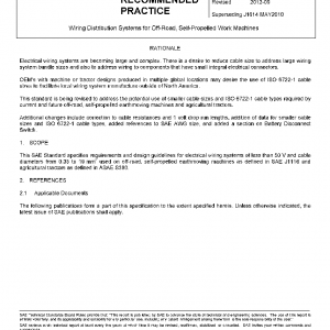 This SAE Standard specifies requirements and design guidelines for electrical wiring systems of less than 50 V and cable diameters from 0.35 to 19 mm2 used on off-road, self-propelled earthmoving machines as defined in SAE J1116 and agricultural tractors as defined in ASAE S390.