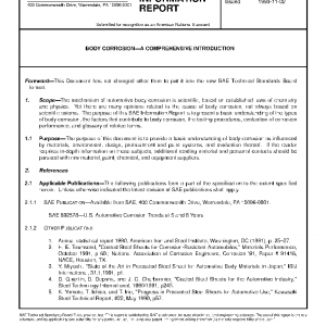 The mechanism of automotive body corrosion is scientific, based on established laws of chemistry and physics. Yet there are many opinions related to the cause of body corrosion, not always based on scientific axioms. The purpose of this SAE Information Report is to present a basic understanding of the types of body corrosion, the factors that contribute to body corrosion, the testing procedures, evaluation of corrosion performance, and glossary of related terms.