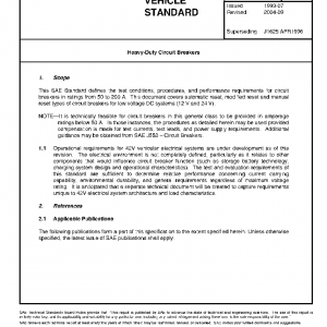 This SAE Standard defines the test conditions, procedures, and performance requirements for circuit breakers in ratings from 50 to 200 A. This document covers automatic reset, modified reset and manual reset types of circuit breakers for low voltage DC systems (12 V and 24 V).