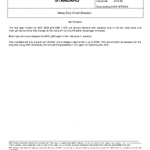 This SAE Recommended Practice defines the test conditions, procedures, and performance requirements for circuit breakers in ratings from 50 to 200 A. The document covers externally mounted automatic reset and manually reset types of circuit breakers for low voltage DC operation (typically 50 V or less).