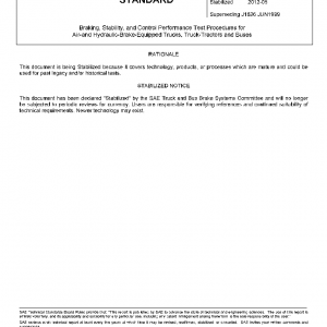 This SAE Recommended Practice provides a road test procedure for trucks, truck-tractors, and buses to evaluate their compliance with Federal Motor Vehicle Safety Standards (FMVSS) 105 and 121; Hydraulic and Air Brake Systems. Units of measure are English in lieu of metric to be commensurate with FMVSS 105 and 121.