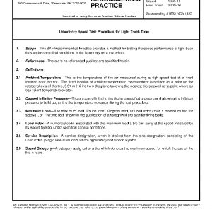 This SAE Recommended Practice provides a method for testing the speed performance of light truck tires under controlled conditions in the laboratory on a test wheel.