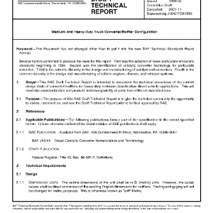 This SAE Draft Technical Report is intended to document the technical consensus of the current design state of converter/mufflers for heavy-duty emission classification diesel vehicle applications. This will maximize standardization and promote interchangeability of parts from different manufacturers. The purpose of this SAE Draft Technical Report is to give the technical community the opportunity to review, comment on, and use the Draft Technical Report prior to its final approval by SAE.