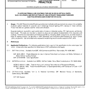 This SAE Recommended Practice provides test methods and requirements to evaluate the suitability of plastic optical materials for possible use in discharge forward lighting (DFL) devices in motor vehicles. These materials are typically used for lenses and reflectors.