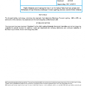 Plastic Materials and Coatings for Use In or On Optical Parts Such as Lenses and Reflectors of High-Intensity Discharge Forward Lighting Devices Used in Motor Vehicles(STABILIZED May 2015)