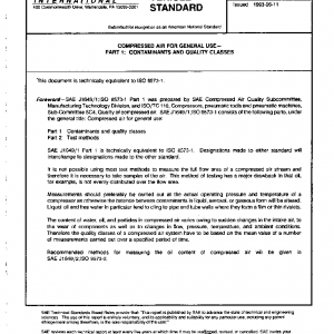 This part of SAE J1649/1 specifies quality classes of industrial compressed air for general use (e.g., for workshops, the construction industry, pneumatic transport, etc.) without consideration of the quality of the air when it is discharged from the compressor. The quality class of compressed air for a particular application has to be based on the mean value of several measurements carried out over a specific period of time and under defined operating conditions.