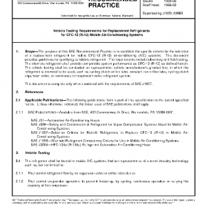 The purpose of this SAE Recommended Practice is to establish the specific criteria for the selection of a replacement refrigerant for mobile CFC-12 (R-12) air-conditioning (A/C) systems. This document provides guidelines for qualifying candidate refrigerant. The requirements include laboratory and field testing. The alternate refrigerant shall provide comparable system performance as CFC-12 (R-12) as defined herein. The vehicle testing shall be conducted on representative vehicle manufacturer’s product line, in which the refrigerant is intended to be used, such as cycling clutch orifice tube, constant run orifice tube, cycling clutch expansion valve, or continuous run expansion valve refrigerant system.