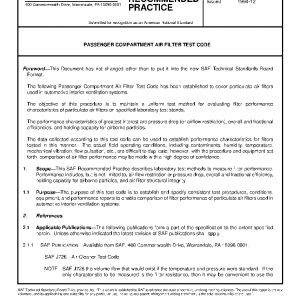 This SAE Recommended Practice describes laboratory test methods to measure filter performance. Performance includes, but is not limited to, air flow restriction or pressure drop, overall and fractional efficiency, holding capacity for airborne particles, and air filter structural integrity.