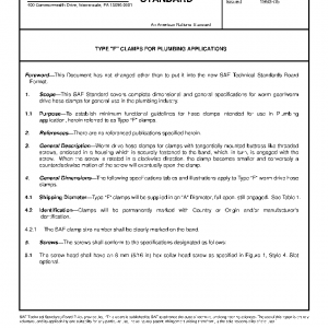 This SAE Standard covers complete dimensional and general specifications for worm gear/worm drive hose clamps for general use in the plumbing industry.