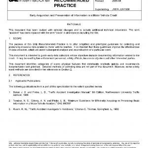 The purpose of this SAE Recommended Practice is to offer simplified and prioritized guidelines for collecting and preserving on-scene data related to motor vehicle crashes. It is intended that these guidelines improve the effectiveness of data collection, which will assist subsequent analysis and reconstruction of a particular crash.