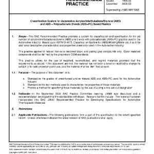 This SAE Recommended Practice provides a system for classification and specification for limited number of acrylonitrile/butadiene/styrene (ABS) and blends with polycarbonate (ABS+PC) plastics used in the Automotive Industry. Based upon ASTM D 4673, Classification System for (ABS) Molding Materials, it calls for additional descriptive characteristics and properties commonly used in the Automotive Industry.
