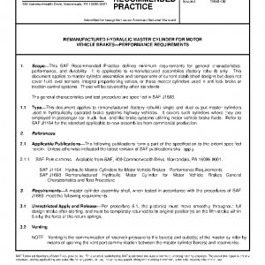 This SAE Recommended Practice defines minimum requirements for general characteristics, performance, and durability. It is applicable to remanufactured assemblies (factory rebuild) only. This document applies to master cylinder assemblies and components of current established designs but does not cover fluid level sensors, integral proportioning valves, or those master cylinders used in anti-lock brake or traction control systems. These will be covered by other standards.