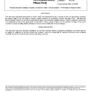 This SAE Recommended Practice defines minimum requirements for general characteristics, performance, and durability. It is applicable to remanufactured assemblies (factory rebuild) only. This document applies to master cylinder assemblies and components of current established designs but does not cover fluid level sensors, integral proportioning valves, or those master cylinders used in anti-lock brake or traction control systems. These will be covered by other standards.